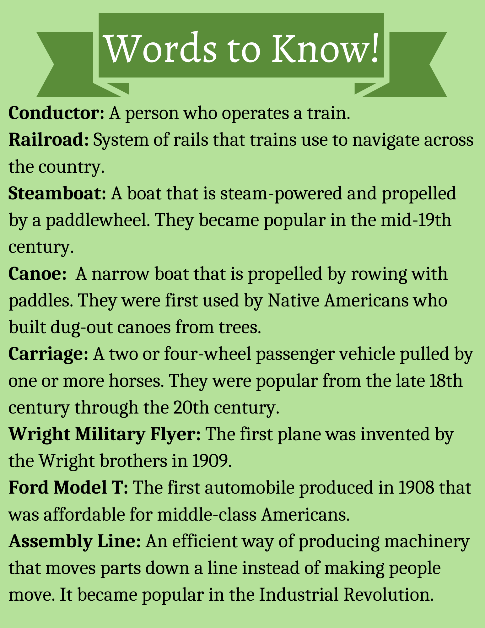 May's "History To-Go" box features Early Travel! You can come by the museum starting Tuesday, May 2, 2023 to pick up a box (limit 2 per family). Limited supplies, so come early! You can select the links below to access the box contents if you cannot get to the museum to pick yours up!