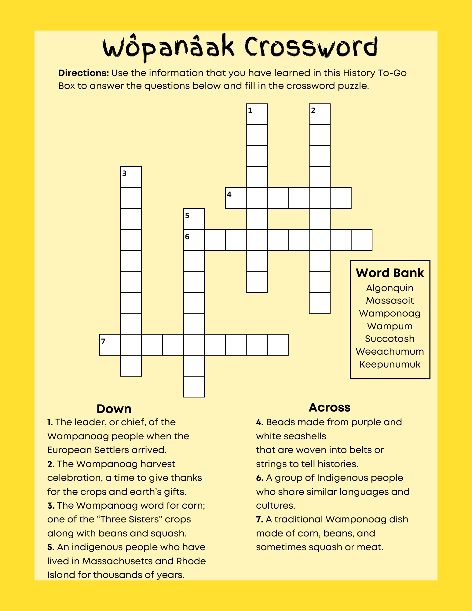 November's History To-Go box features Keepunumuk: Wampanoag Thanksgiving. You can come by the museum starting Tuesday, November 5, 2024, to pick up a box (limit 2 per family). Supplies are limited, so come early. Click the links below to download the box's content if you can't pick up a kit in person.